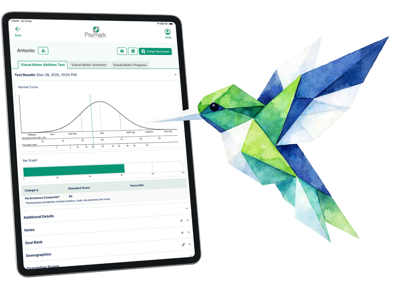 The Psymark Visual-Motor Abilities Test (VMAT) is a digital measure of visual-motor functioning administered on the iPad, featuring real-time, automated scoring. The VMAT is designed so that it may used either as a stand-alone measure or it can be incorporated into comprehensive evaluations by occupational therapists, school psychologists, clinical psychologists, and medical professionals across a broad range of assessment contexts.